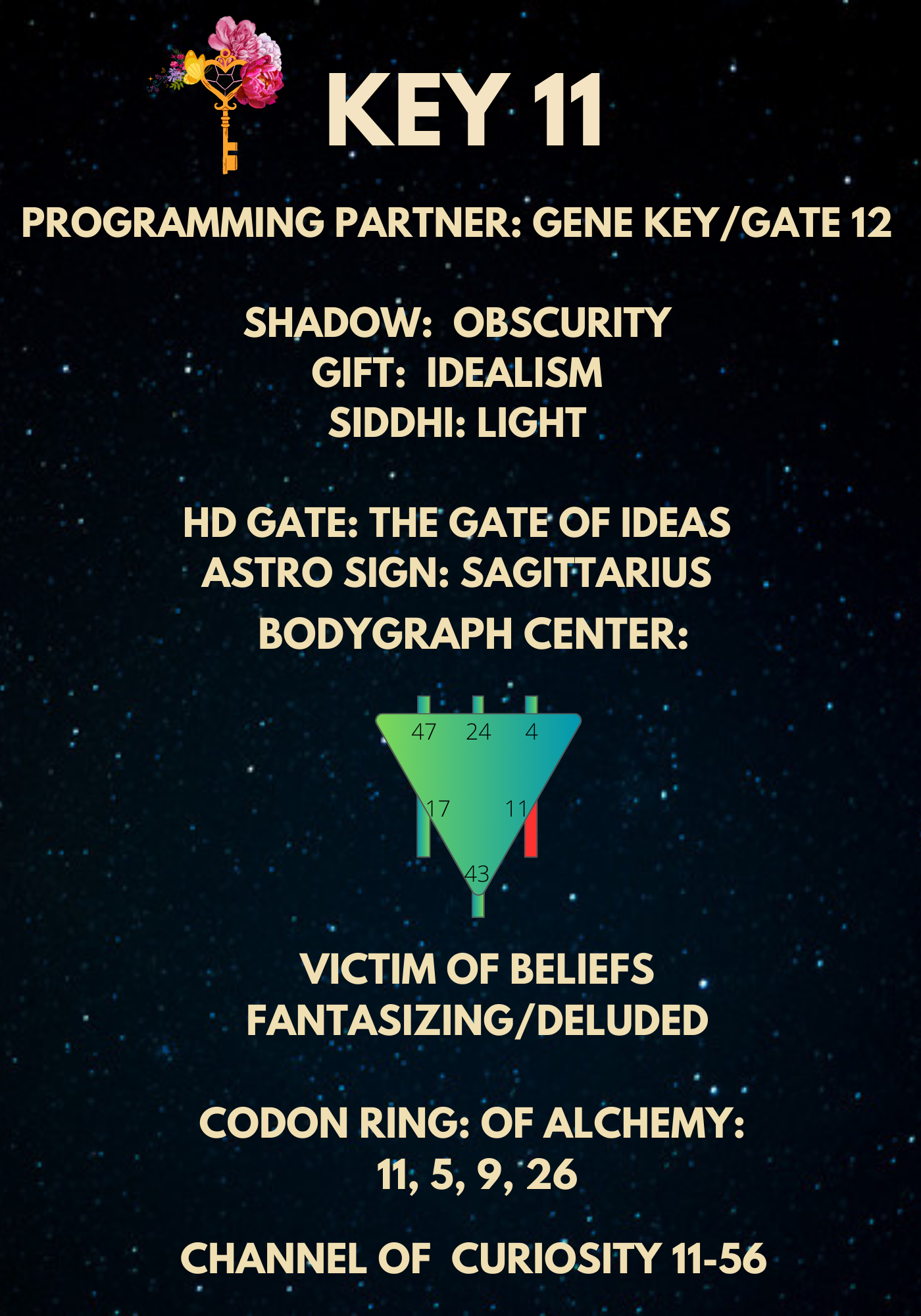 The 11th Gene Key's Shadow of Obscurity delves into the interplay between light and the human mind, affecting the way your brain processes and communicates light. This shadow creates a virtual reality marked by fear, distorting your perception of the world. It restricts the right hemisphere of the brain, associated with intuition and creativity, leading to a limited and skewed understanding of reality. Overcoming the 11th Shadow involves navigating a minefield of lost dreams, escapism, denial, guilt, and repression, ultimately requiring trust in the transformative power of dream imagery for a path towards greater clarity and a courageous shift to the 11th Gift.