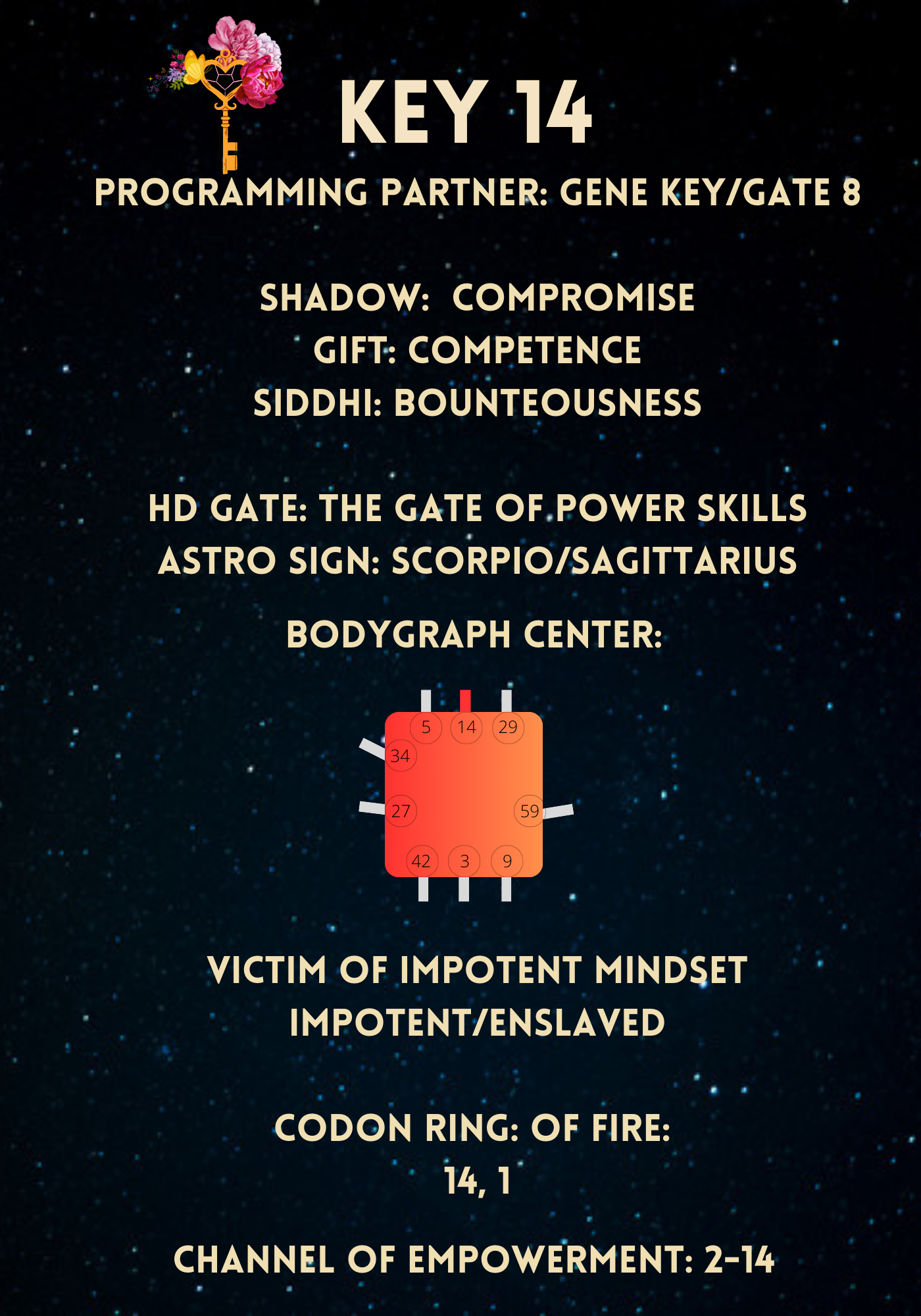 The Gift of Gene Key 14 is "Competence." It's the ability to excel at what you do when you love it and stop compromising. Competence encompasses efficiency, enthusiasm, flair, and flexibility. It's about finding the quickest solutions, being fulfilled by your work, doing things uniquely, and adapting skills to various areas. Those with this Gift can inspire teams, attract support and wealth, and continually expand their potential by fearlessly taking on new tasks.