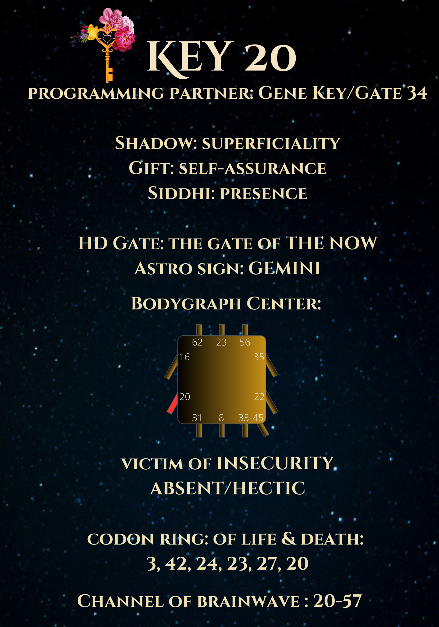The Gift of Gene Key 20 is Self Assurance. It's about trusting life's flow and surrendering to it instead of relying solely on your thoughts to make decisions. With Self Assurance, you feel a sense of confidence and ease, knowing that everything will be okay. It's like finding a deep inner trust and relaxation, allowing life to unfold naturally.