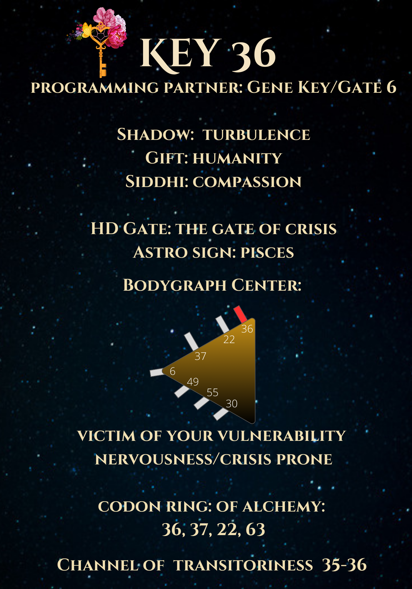 The gift of the 36th Gene Key is called Humanity. It's about understanding yourself and others better by facing your struggles with honesty. When you do this, you become more connected to people and grow as a person. This gift helps you handle tough situations maturely and become someone others trust for support. It teaches us to celebrate being human and to trust in our own strength, even during hard times. Overall, it helps us become more compassionate and understanding towards others.