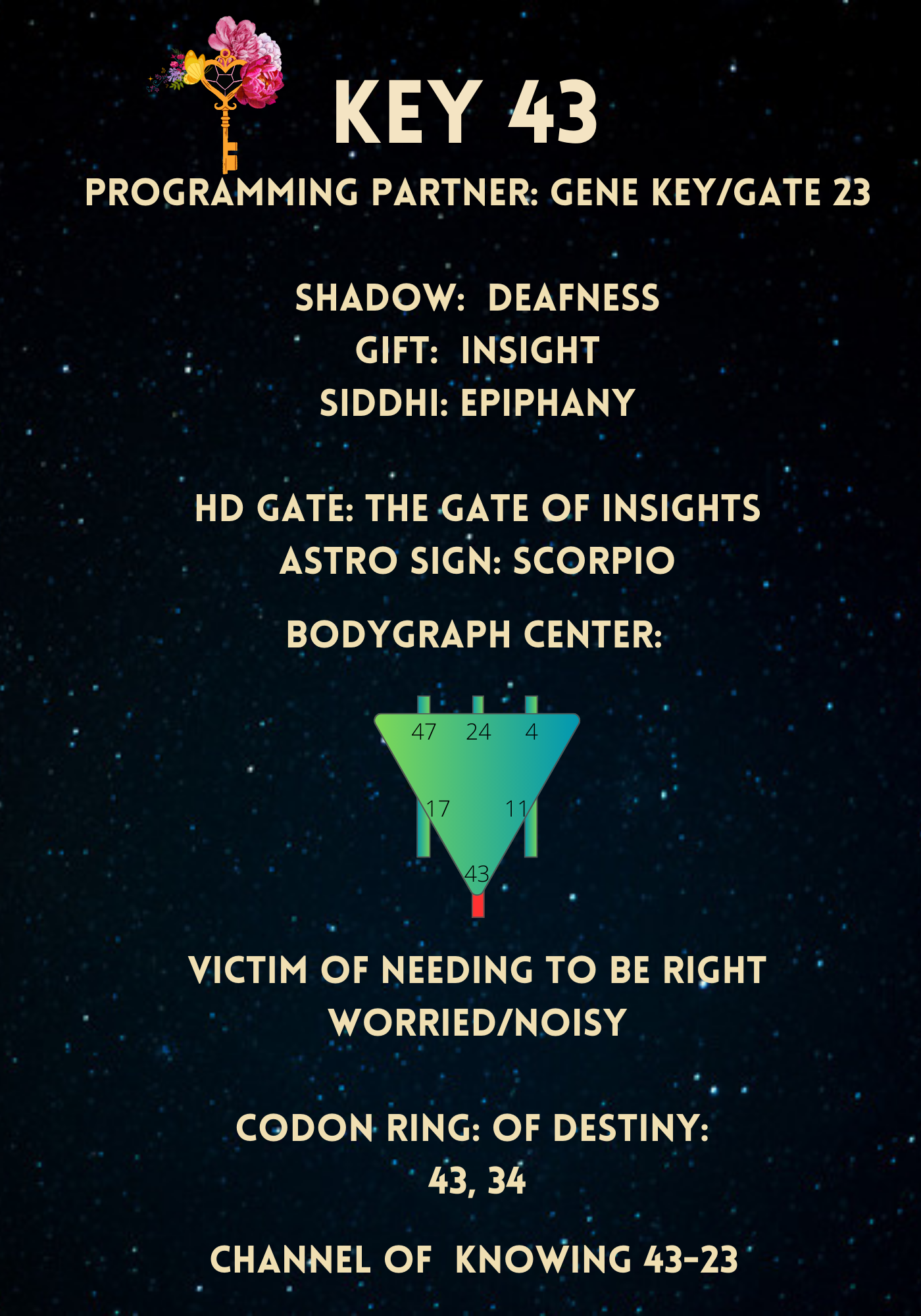 The gift of Gene Key 43 is "Insight." It embodies the spirit of the rebel within us, urging us to embrace our unique creative potential. This gift empowers us to trust our inner voice, leading to profound insights and the ability to cut new paths without being confined by societal norms. Insight encourages simplicity, creativity, and a deep connection with our inner wisdom, ultimately revealing the dance between chance and love in the unfolding of our destiny.