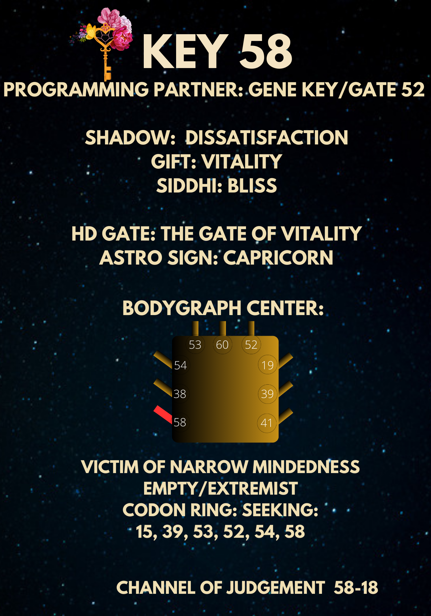 The Shadow of Gene Key 58 is Dissatisfaction. Instead of directly pointing to specific emotions like sadness or anxiety, it's more of a general feeling of lacking fulfillment and inner restlessness. It's like when the calm surface of a lake is disrupted, representing the loss of our natural state of being. The root of this dissatisfaction lies in our constant focus on the future, always striving for improvement or service, driven by the mind. Ironically, our quest for happiness outside ourselves only leads to more discontent. However, this dissatisfaction serves a purpose, pushing us to realize that true joy comes from within. It's like a pressure cooker, forcing us to confront our inner selves and eventually leading to a deeper understanding of our own vitality.