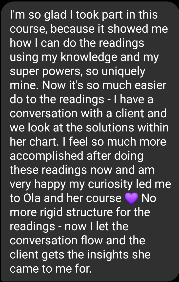 You will learn to do impactful and transformational chart readings. Trust yourself and start doing readings like no one else can, with zero or very minimal pre-session preparation.